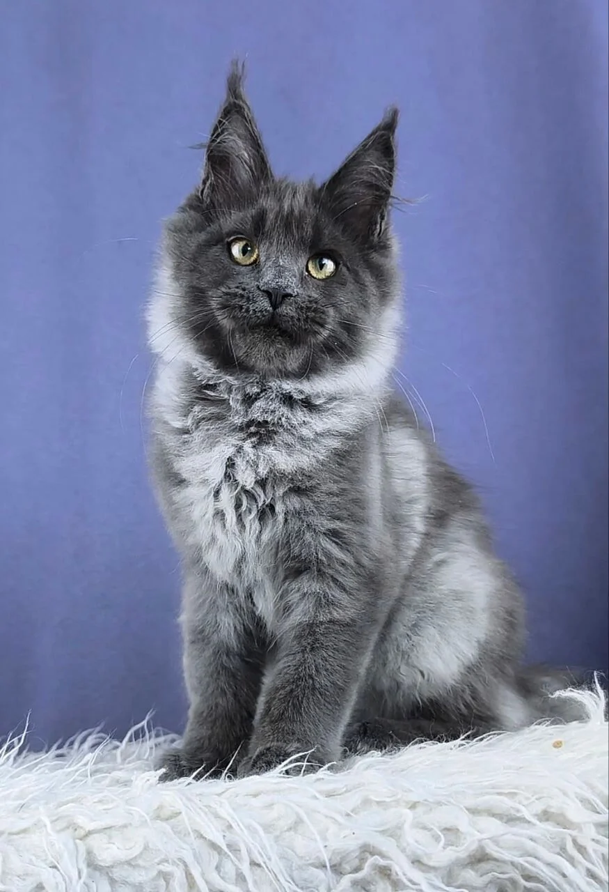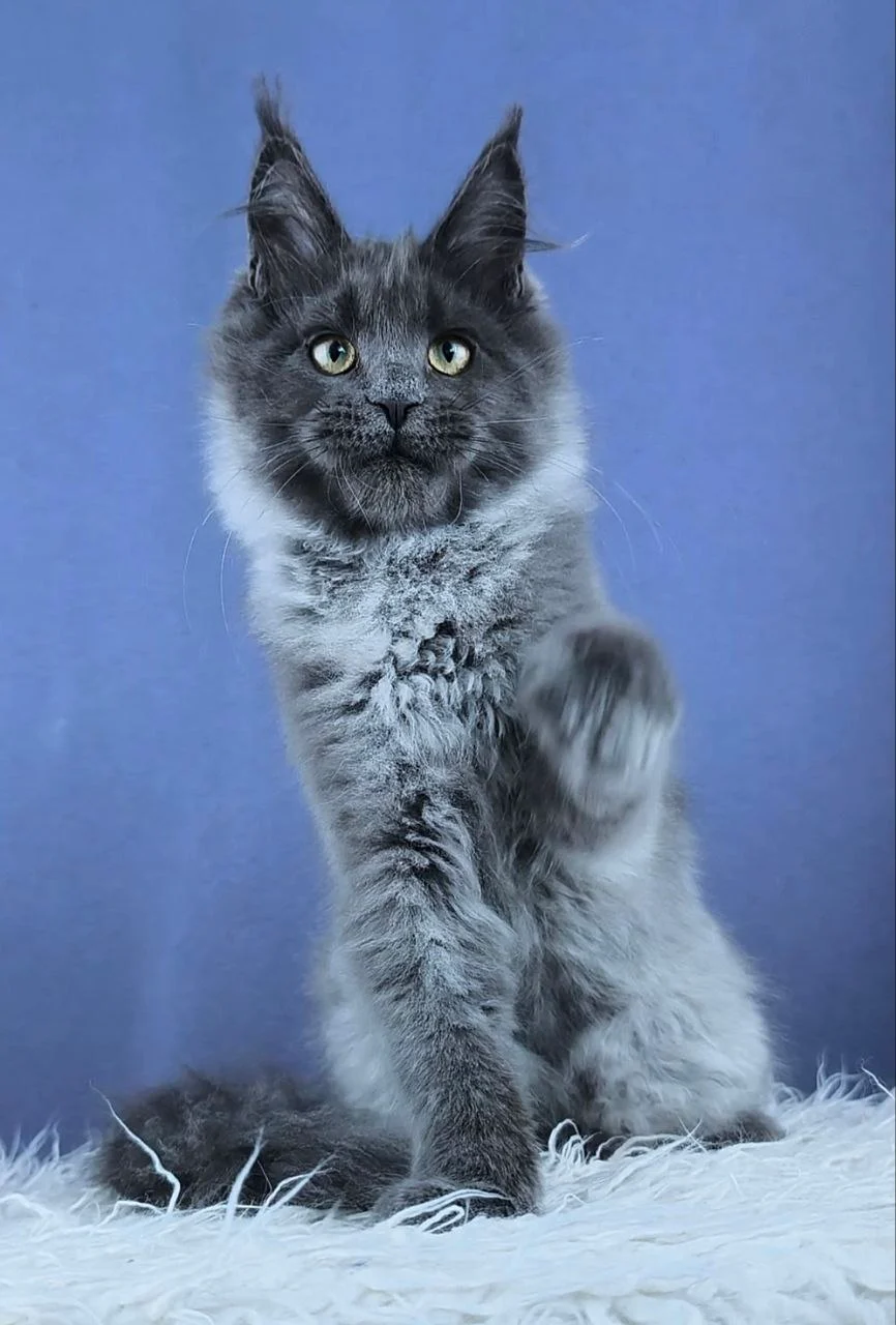Hi, I’m Zavet an enchanting blue silver Maine Coon kittens Scotland with mesmerizing yellow eyes, a soft misty coat, and a gentle, calm presence. My plush, silky fur that shimmers softly under your touch and a curious, affectionate nature, tail is long, fluffy, and made for slow, regal swishes. I eat Royal Canin Maine Coon and feel my best on a steady routine with good meals, fresh water, and cozy spots where I can relax near my people and watch everything going on.
